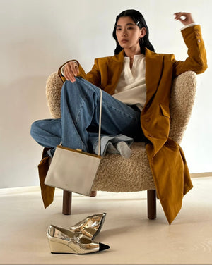 • Gold hardware shiny