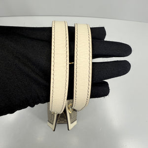 - White leather trim shows minimal signs of use, with slight natural patina consistent with gentle wear