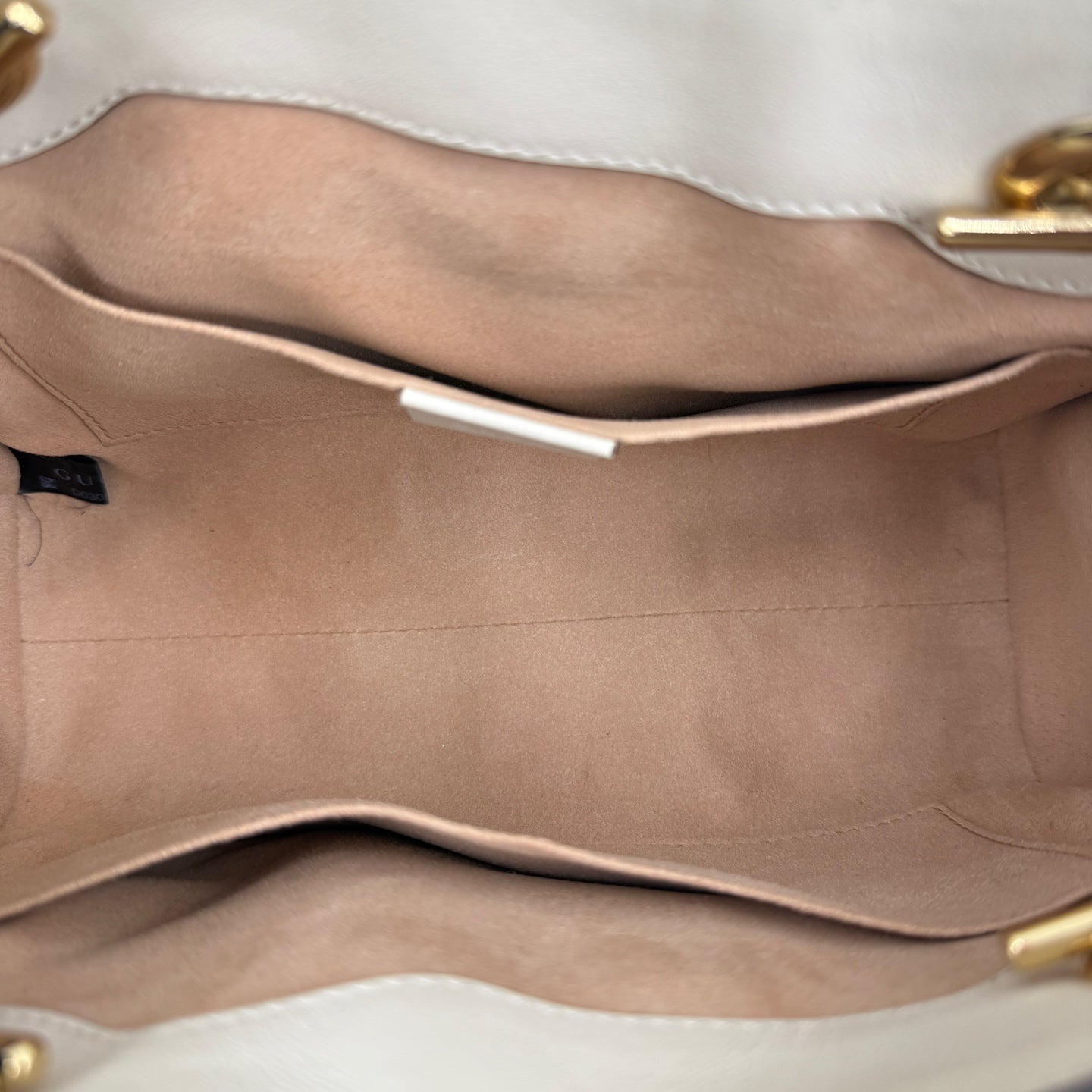 - Beige suede interior lining is clean with no stains or damage