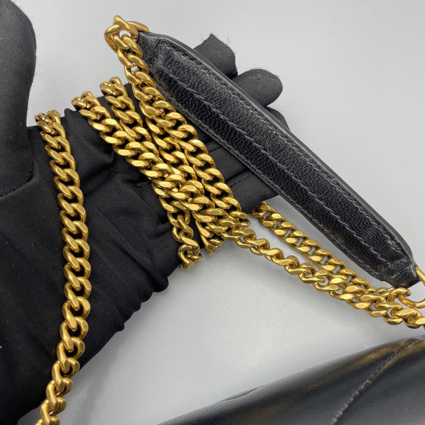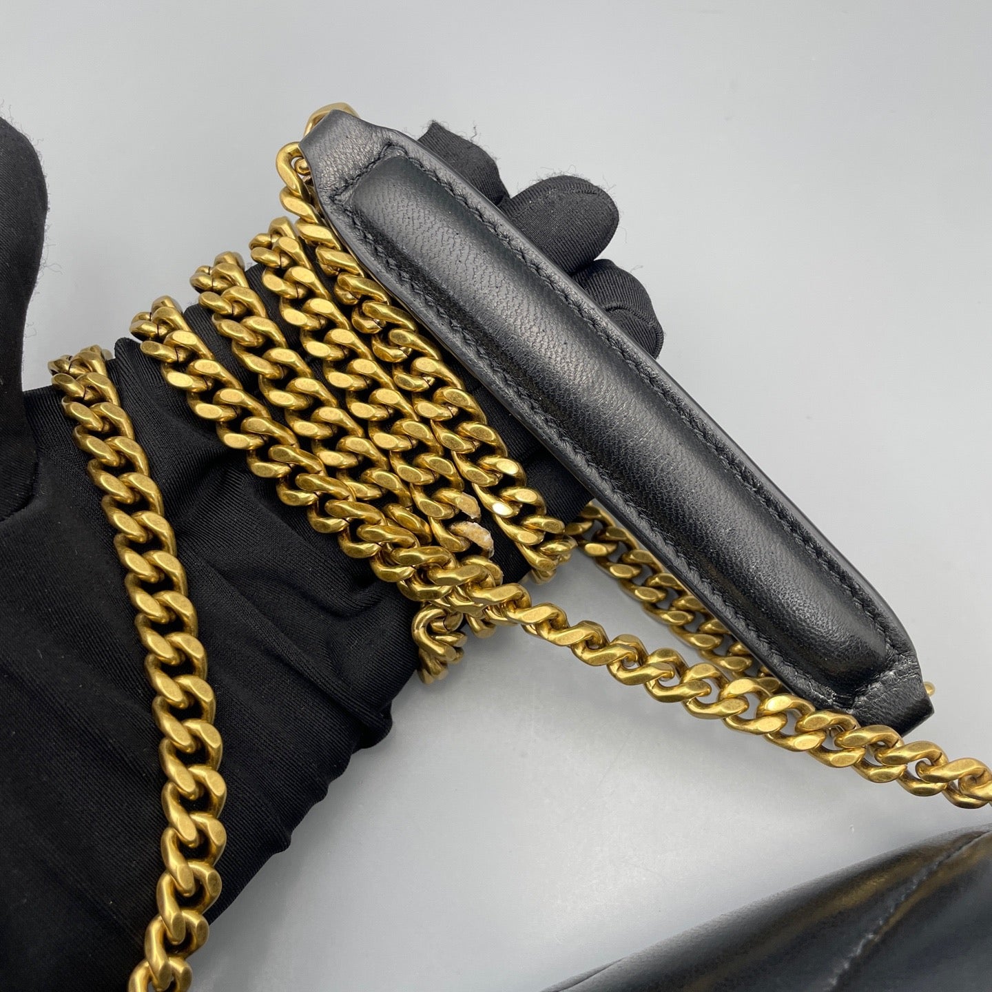• Gold-tone hardware retains rich patina with minimal scratches