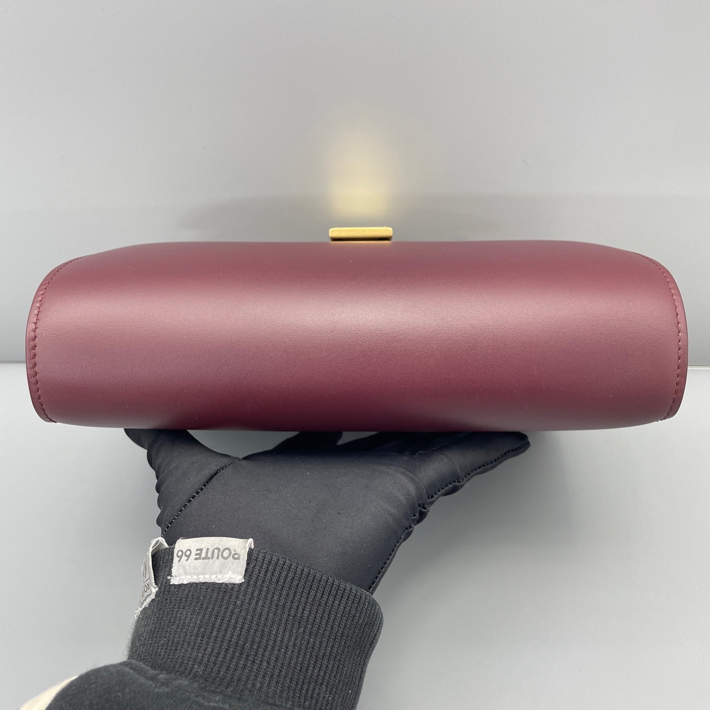 - Exterior: Crisp smooth burgundy calfskin leather with minor light scratches (visible in close-ups); no scuffs, rips, or discoloration.