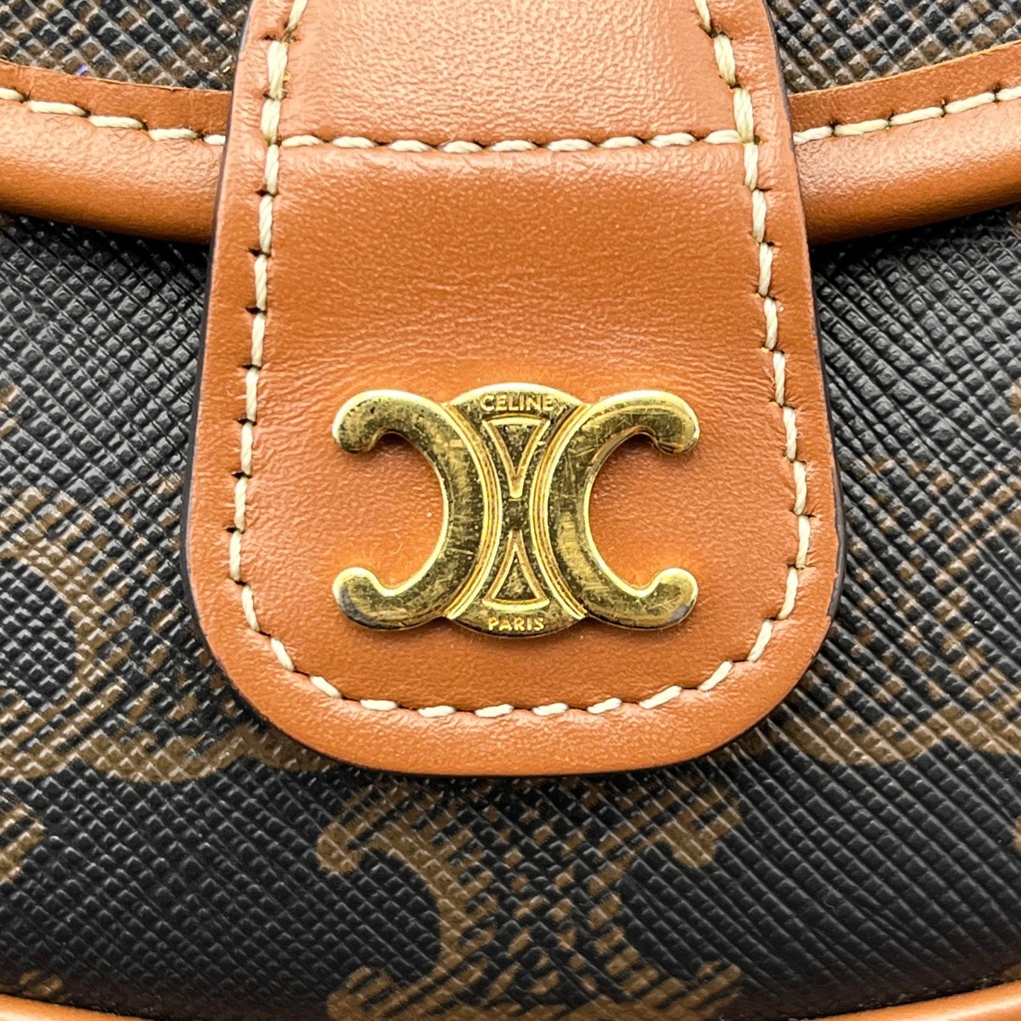 • Gold-tone Triomphe clasp retains polished finish with minor surface scratches