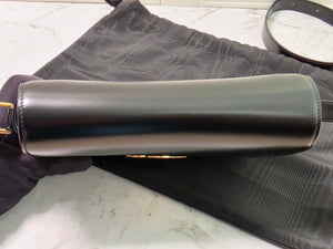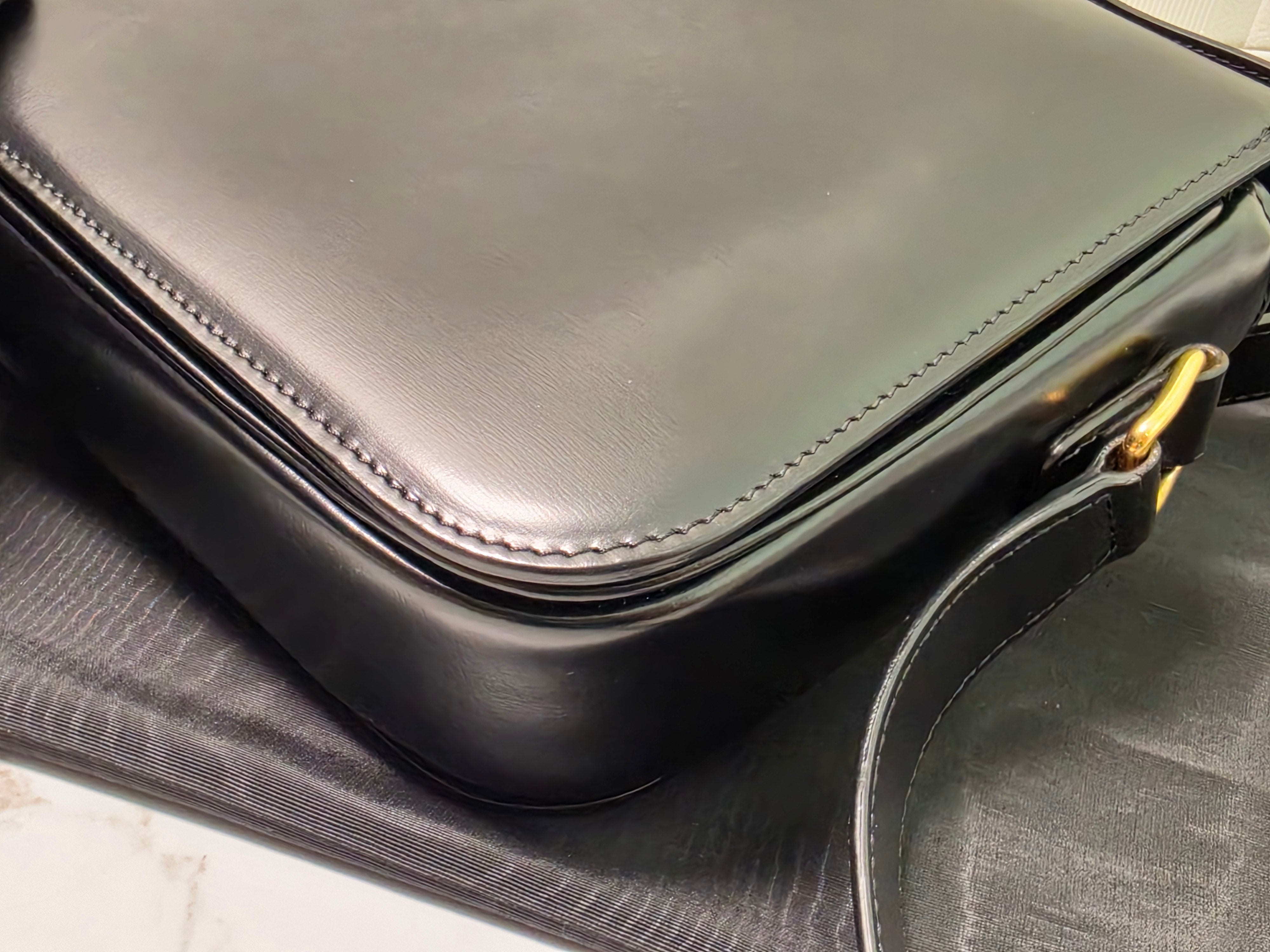 - Exterior: Smooth, glossy black shiny calfskin leather with crisp stitching, no other significant scuffs, scratches, or wear.