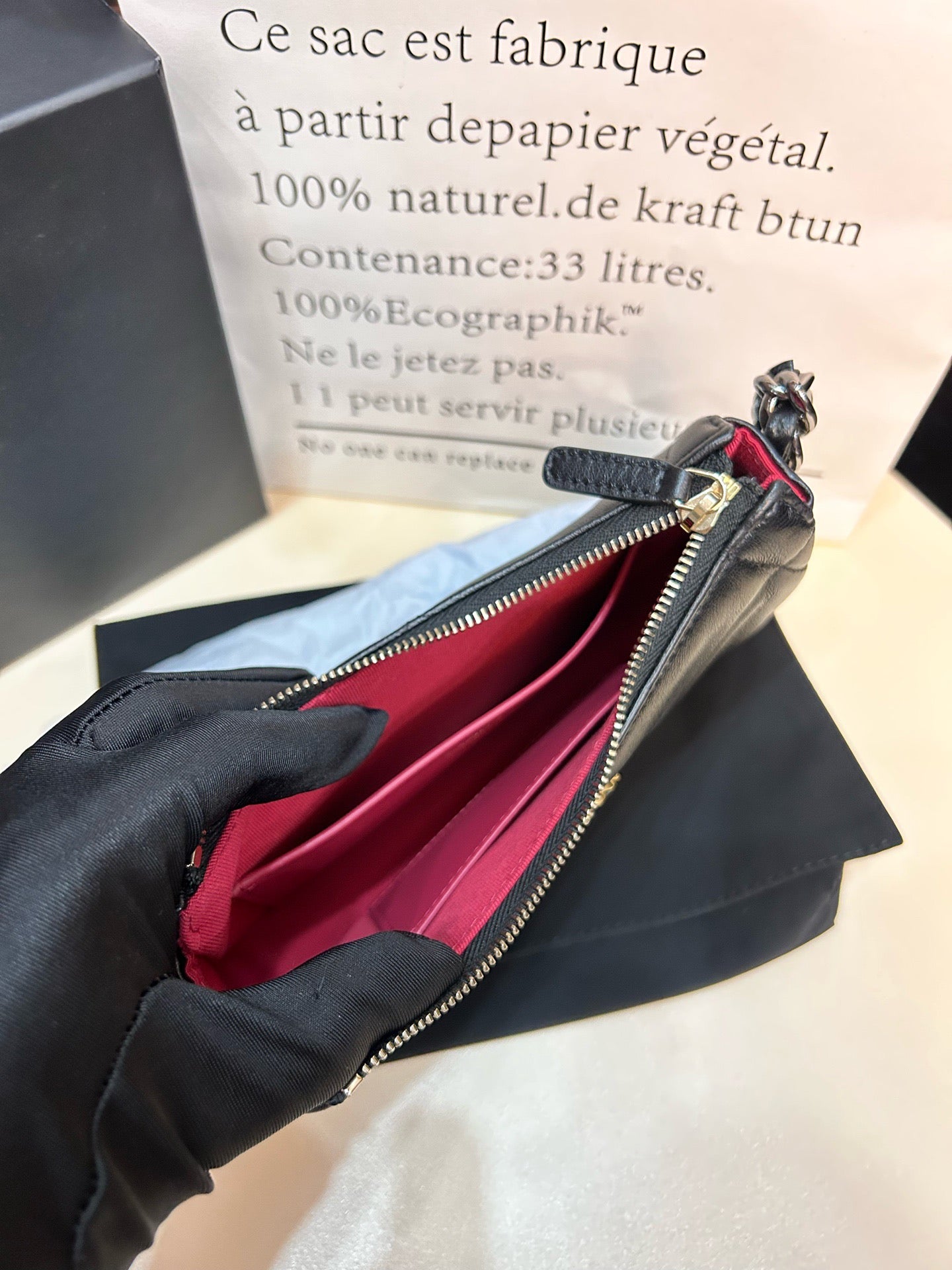 • Black lambskin exterior is pristine with no scratches, stains, or wear