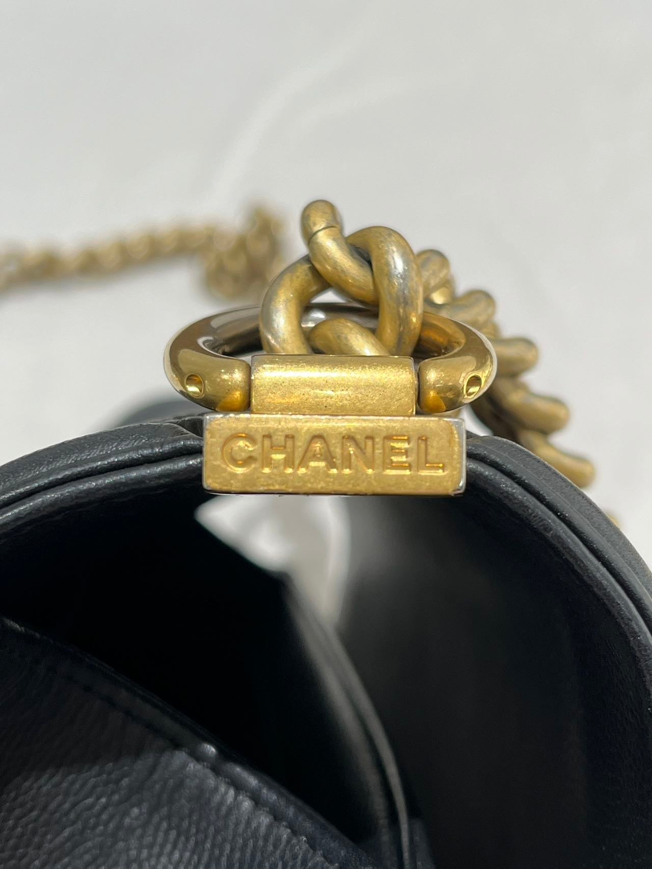 Authentic Pre-owned Chanel Le Boy Medium Black Caviar Aged Gold HW Full Set