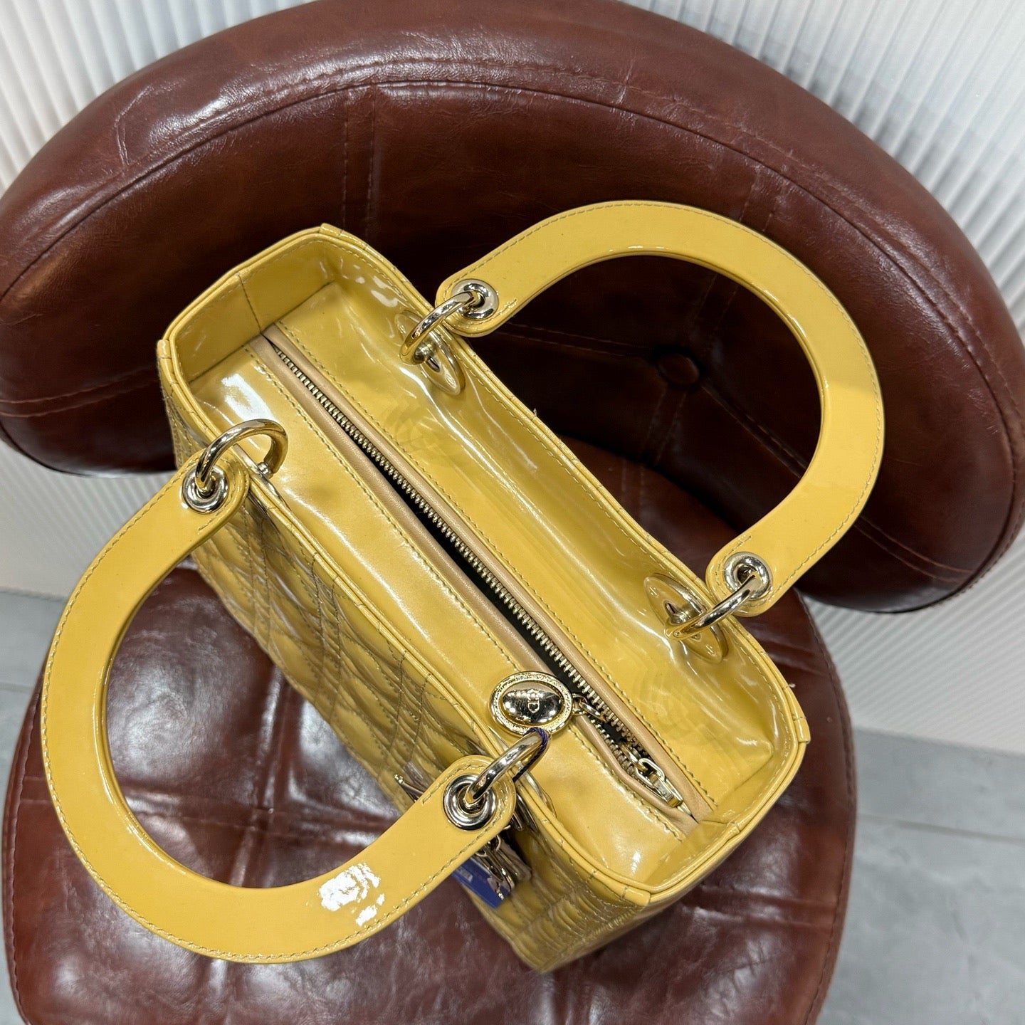• Brown patent leather exterior is glossy and well-maintained with minimal signs of wear
