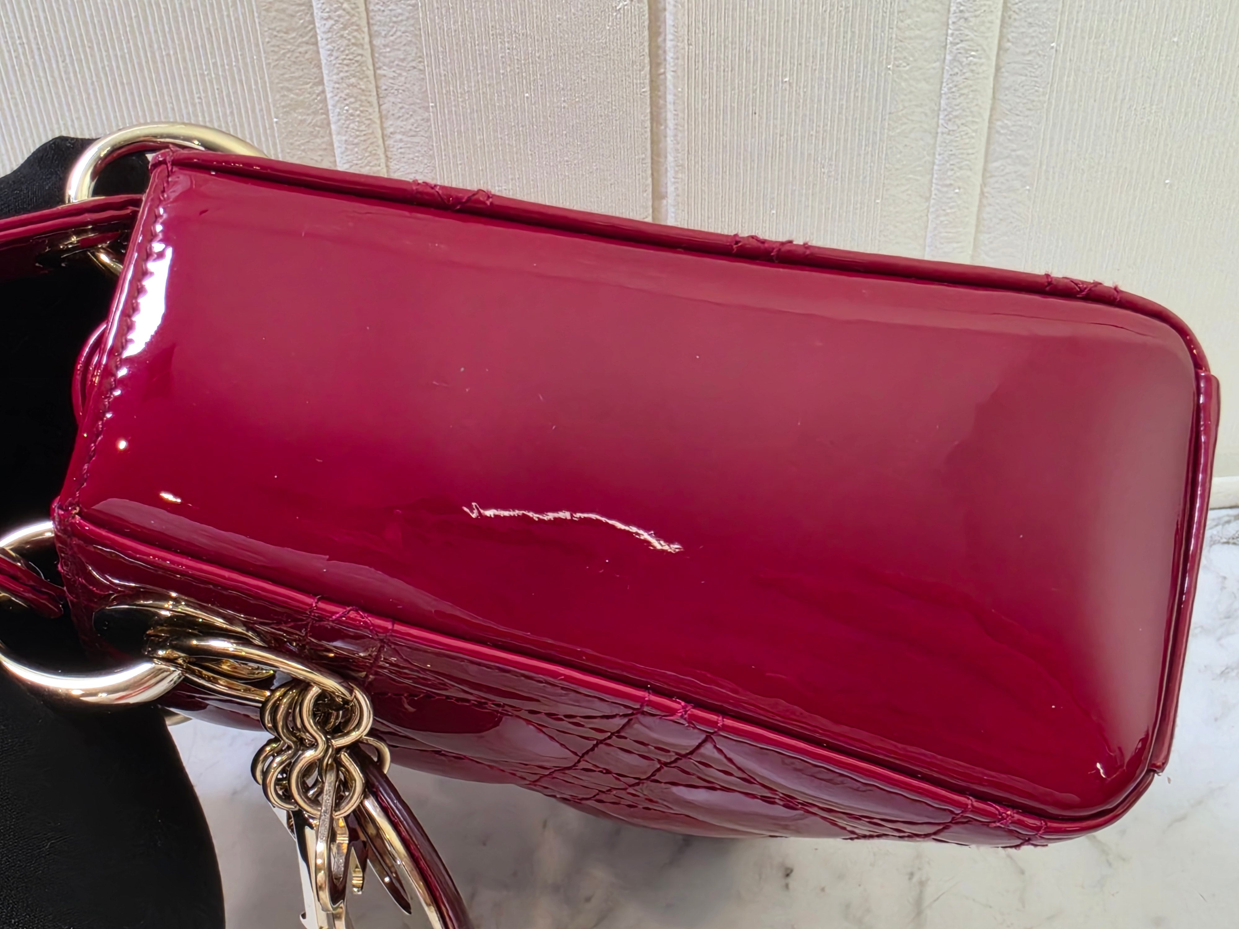 - Exterior: Glossy patent leather with crisp Cannage quilting. A few small dark spots are visible on the patent leather base (as shown in close-up photos), no significant scratches, scuffs, or fading.