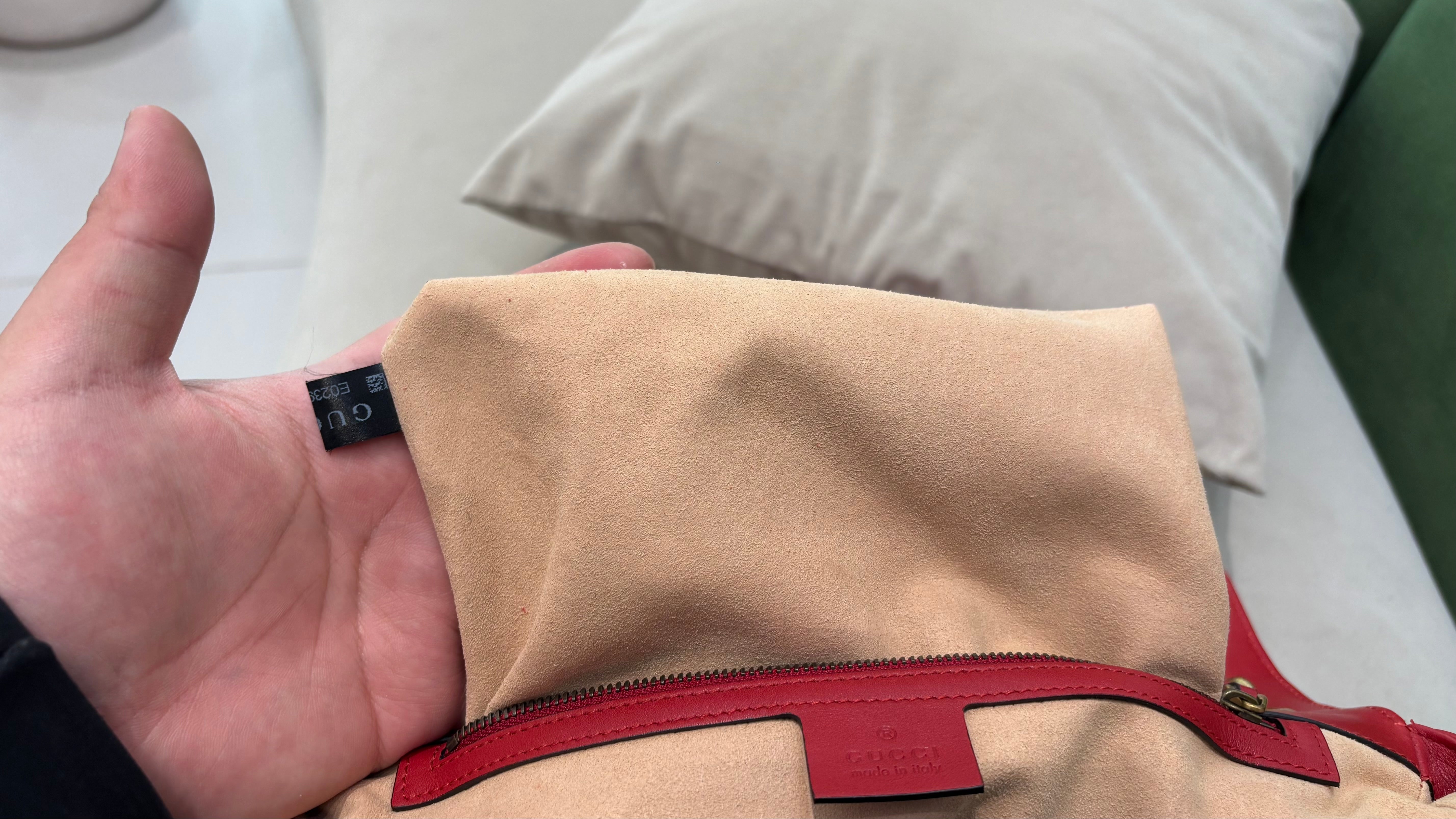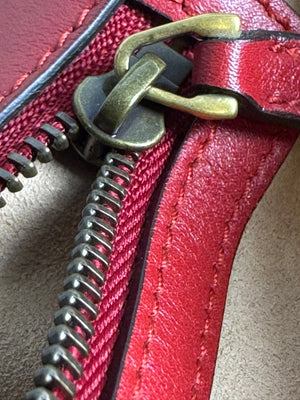 • Red quilted leather exterior is clean and supple with light natural creasing