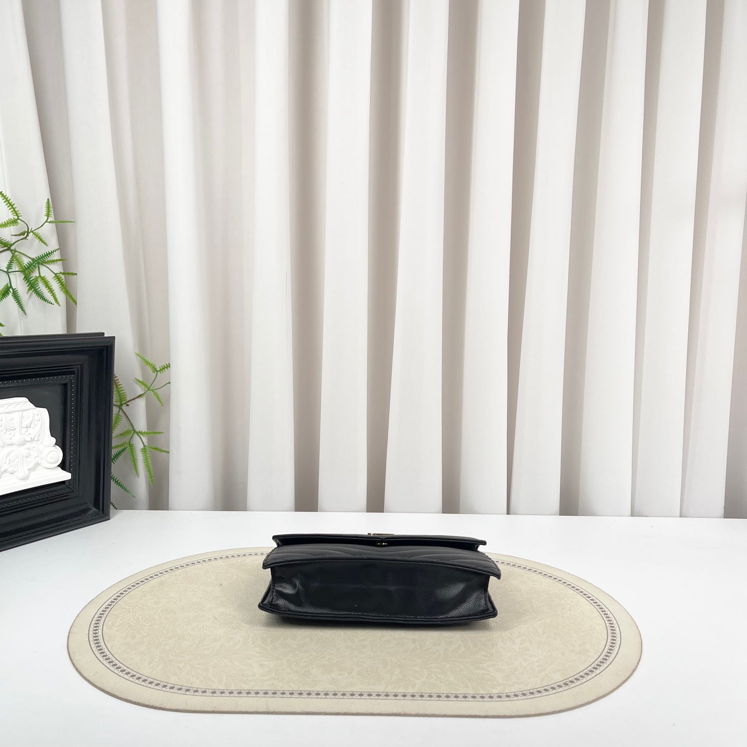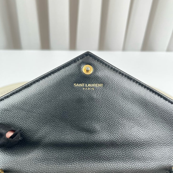 • Features: Signature YSL logo plaque, classic envelope design, gold-tone hardware, detachable chain strap