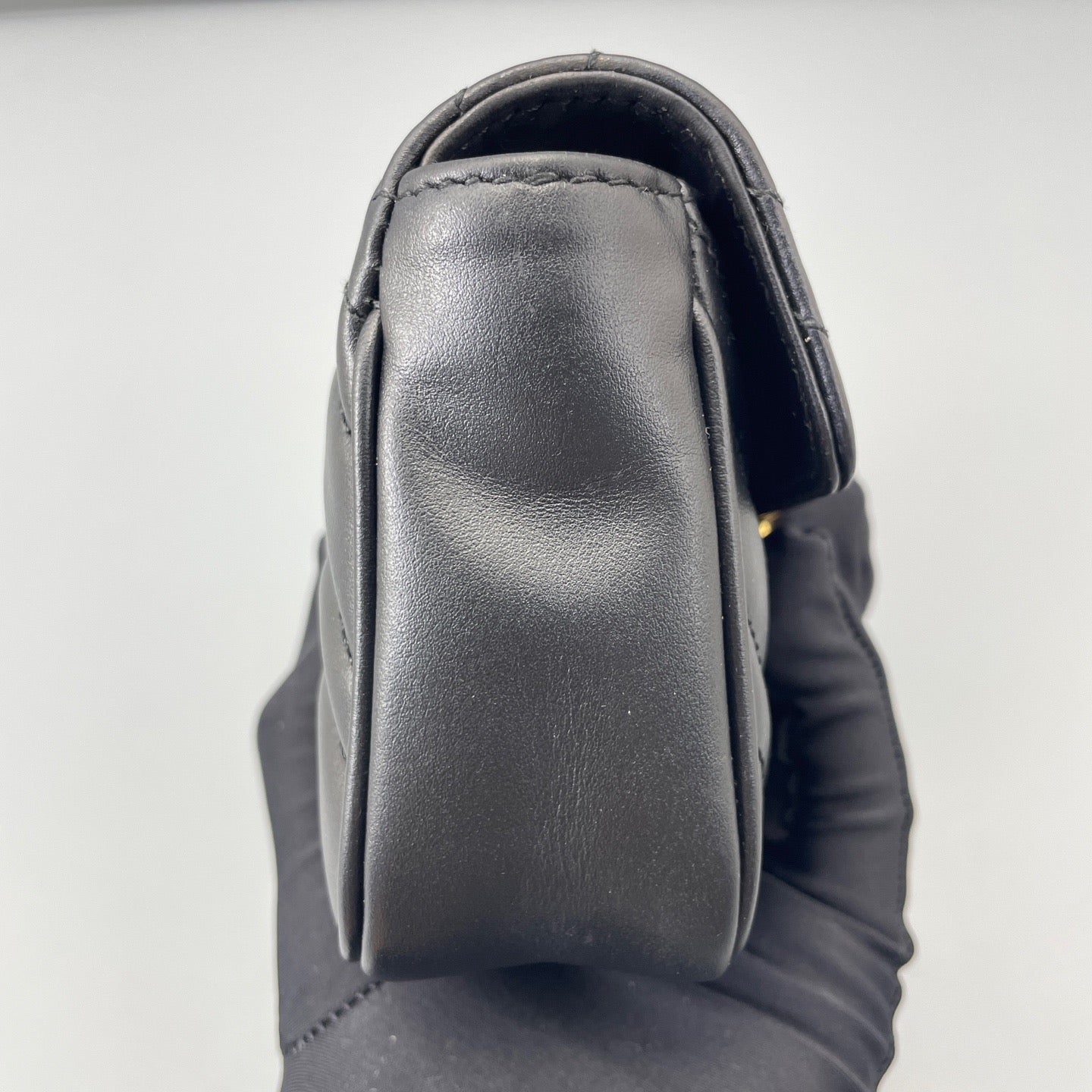 • Chevron-quilted calfskin leather is clean and supple with no major scuffs, tears or stains