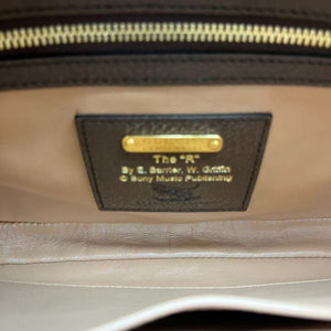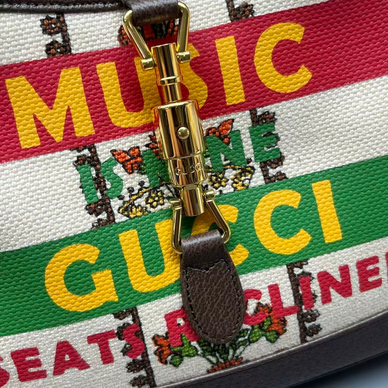 Material: Printed canvas (with "MUSIC/GUCCI" graphic) + smooth brown leather trim