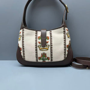 The Gucci Jackie 1961 is an iconic heritage piece reimagined by Alessandro Michele, and this iteration features the brand’s 100th Anniversary "MUSIC" print (part of the 2021 Gucci 100 Special Collection). Blending retro canvas with rich leather trim, this small hobo bag balances vintage charm and modern versatility—ideal for everyday styling or adding a playful pop to outfits. Its compact silhouette nods to 1960s elegance while fitting daily essentials like a phone, wallet, and lipstick.