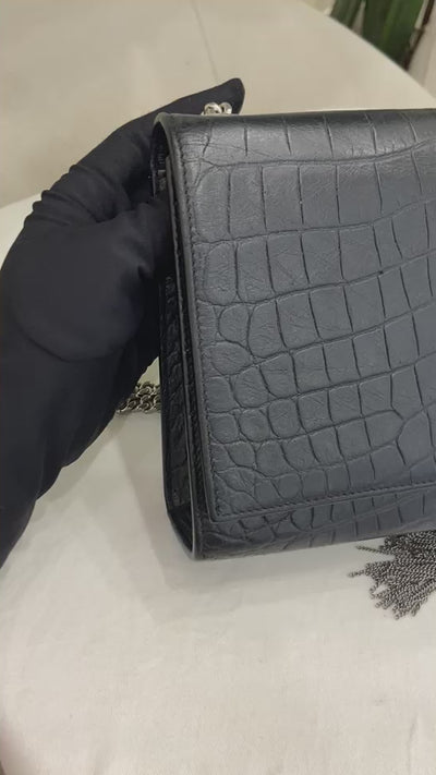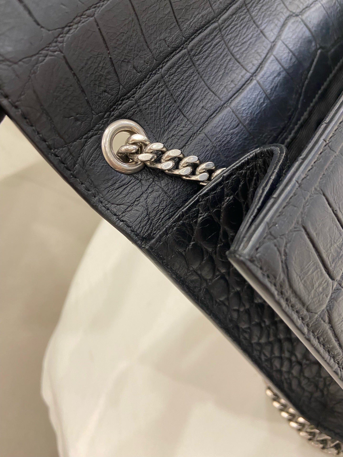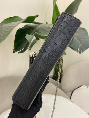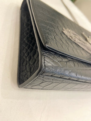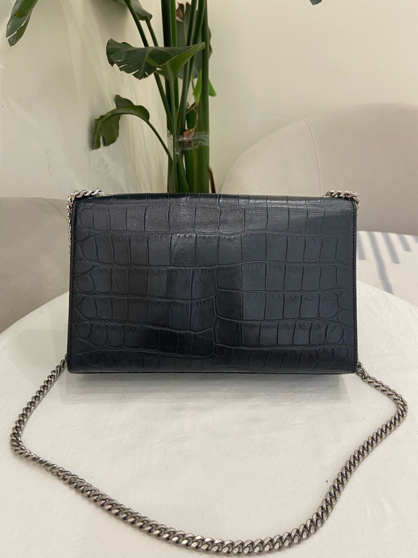 The YSL Kate Medium Tassel is an iconic luxury handbag defined by its sleek **black croc-embossed leather** construction. The textured embossed material adds a bold, sophisticated edge, while the slim rectangular silhouette balances timeless glamour with everyday functionality — ideal for evening events or elevated casual wear. Its signature silver-tone "YSL" logo hardware (a hallmark of Saint Laurent design) and cascading chain tassel elevate the aesthetic, and the compact interior fits essentials like a phone, wallet, and lipstick.