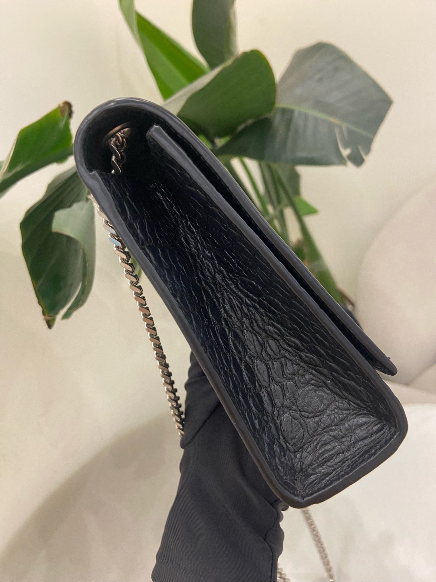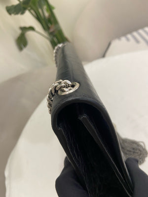 - Material: **Black croc-embossed leather**; silver-tone metal hardware